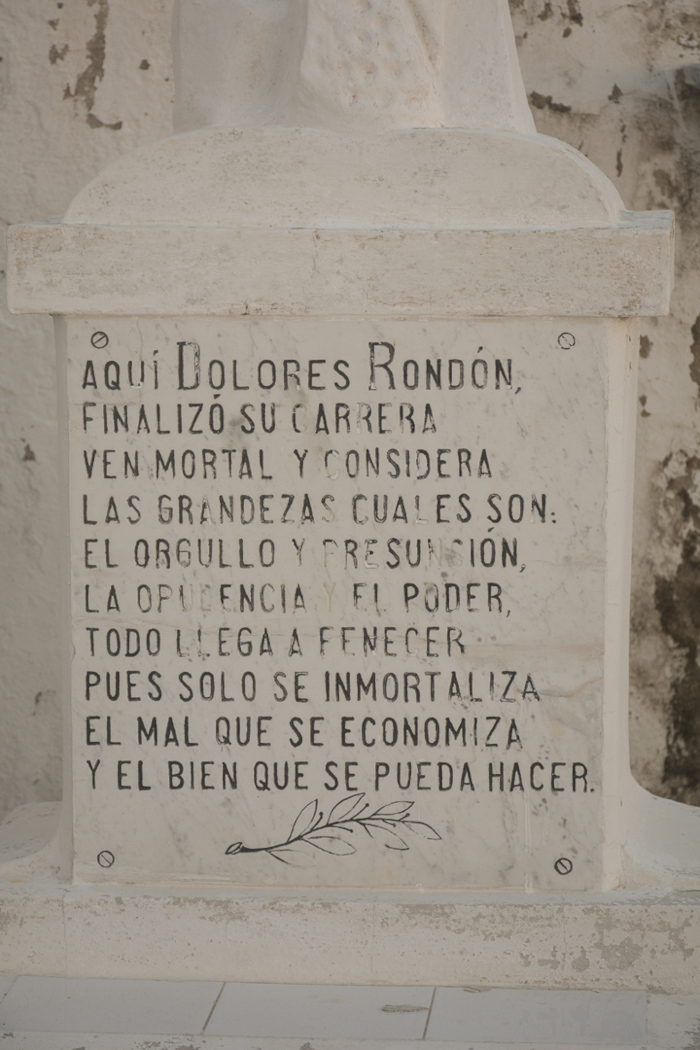 Ya se sabe lo que se ha repetido de esta hermosa mujer y el apasionado barbero-poeta que le amó desde siempre, el matrimonio ventajoso de la joven con un oficial español, su viaje a España, la aristocracia, la viudez, el regreso a Puerto Príncipe, la ruina, la pobreza y la enfermedad durante la cual el fiel amor le atendió hasta su muerte. Se recrea la leyenda con aquel epitafio que dejó el poeta junto a la tumba de la amada eterna: “Aquí Dolores Rondón…” Tal es la leyenda que por casi dos siglos guarda nuestra ciudad, leyenda con una historia que tal como la conocemos merecería ser real por su toque de dramático romanticismo.