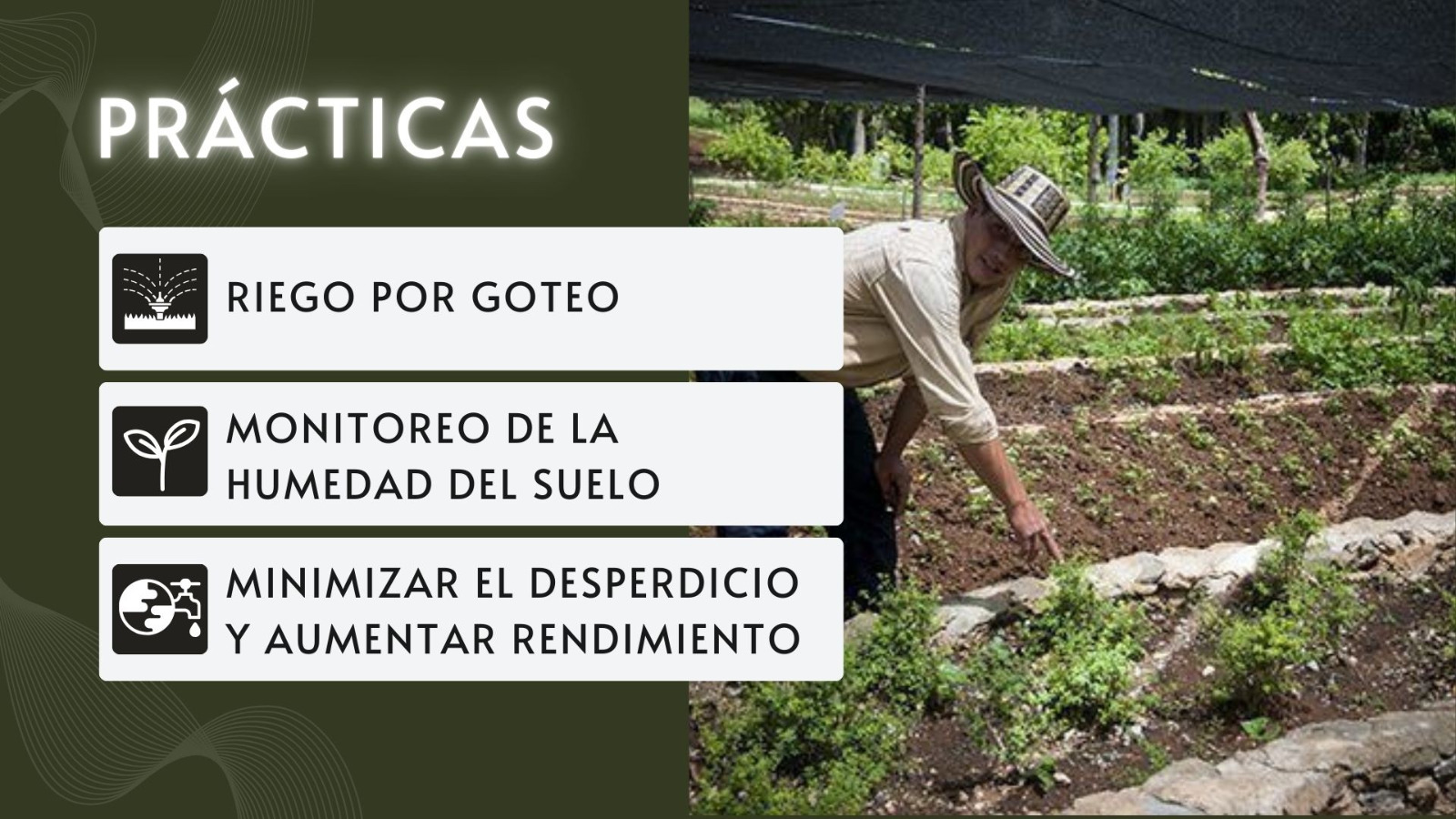 Las buenas prácticas agrícolas incluyen el riego por goteo, el monitoreo del contenido de humedad del suelo y la aplicación precisa de agua en función de las necesidades de los cultivos, lo que ayuda a minimizar el desperdicio y maximizar el rendimiento.